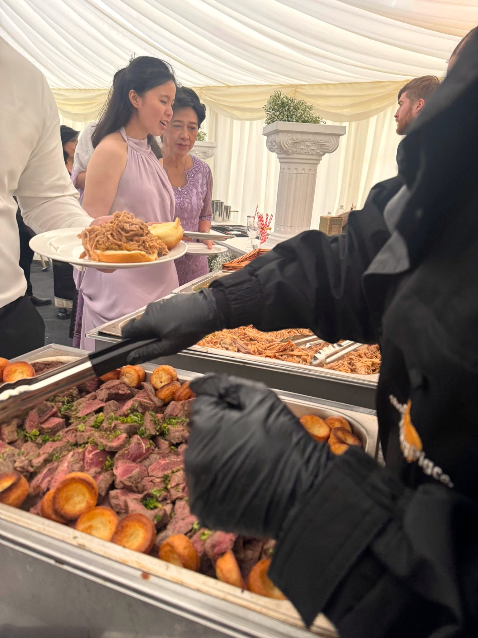 Any party is best served with a hog roast, but Matthew and Priskila went one step further by also ordering for our delicious beef roast, lovingly cooked up fresh on site and served with mini Yorkshire puddings. Served buffet style along with BBQ pulled jackfruit, seasonal veg, leafy greens, Caesar  salad, roasted baby new potatoes, and gluten free rolls, guests came in by the dozen to enjoy our foods and of course a bit of our wonderful Hog Roast Boxted banter while our friendly chefs served them with a smile!
